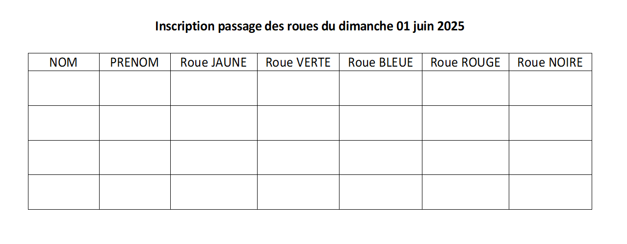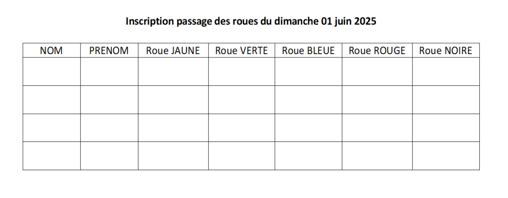 La session de « passage des roues » 2025 aura lieu le DIMANCHE 1er juin 2025 à partir de 9 heures.